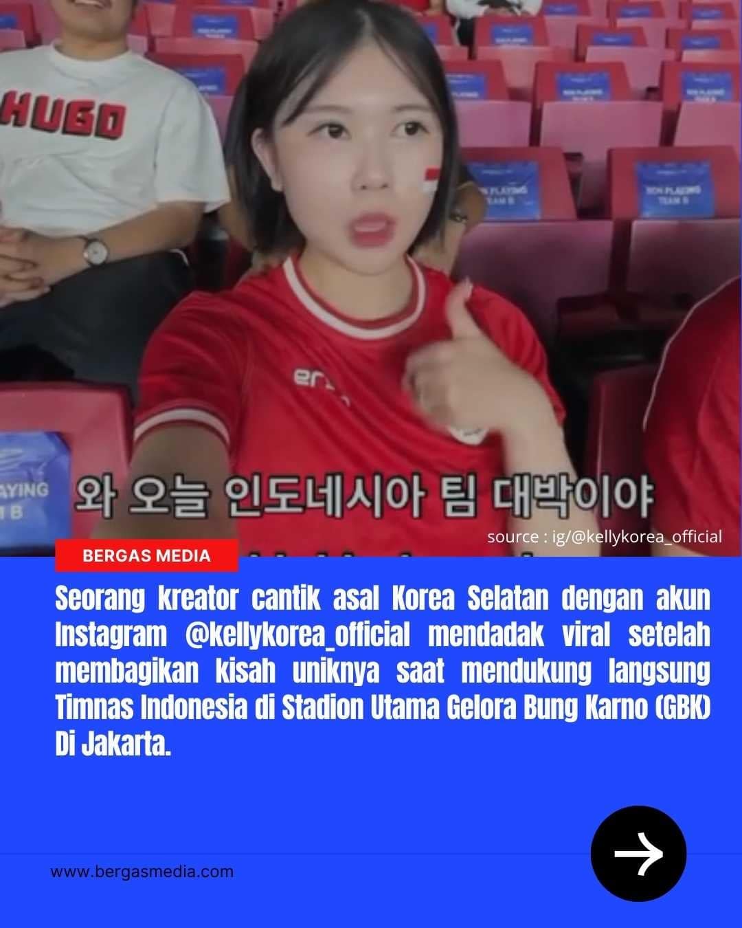 Kreator cantik asal Korea Selatan dengan akun Instagram @kellykorea_official mendadak viral setelah membagikan kisah uniknya saat mendukung langsung Timnas Indonesia di Stadion Utama Gelora Bung Karno (GBK) Jakarta.