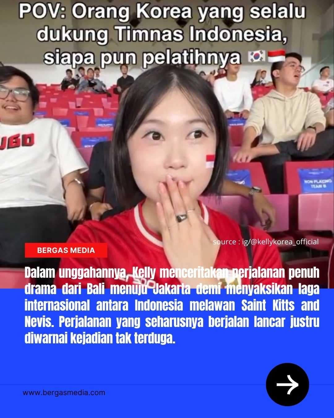 Kreator cantik asal Korea Selatan dengan akun Instagram @kellykorea_official mendadak viral setelah membagikan kisah uniknya saat mendukung langsung Timnas Indonesia di Stadion Utama Gelora Bung Karno (GBK) Jakarta.